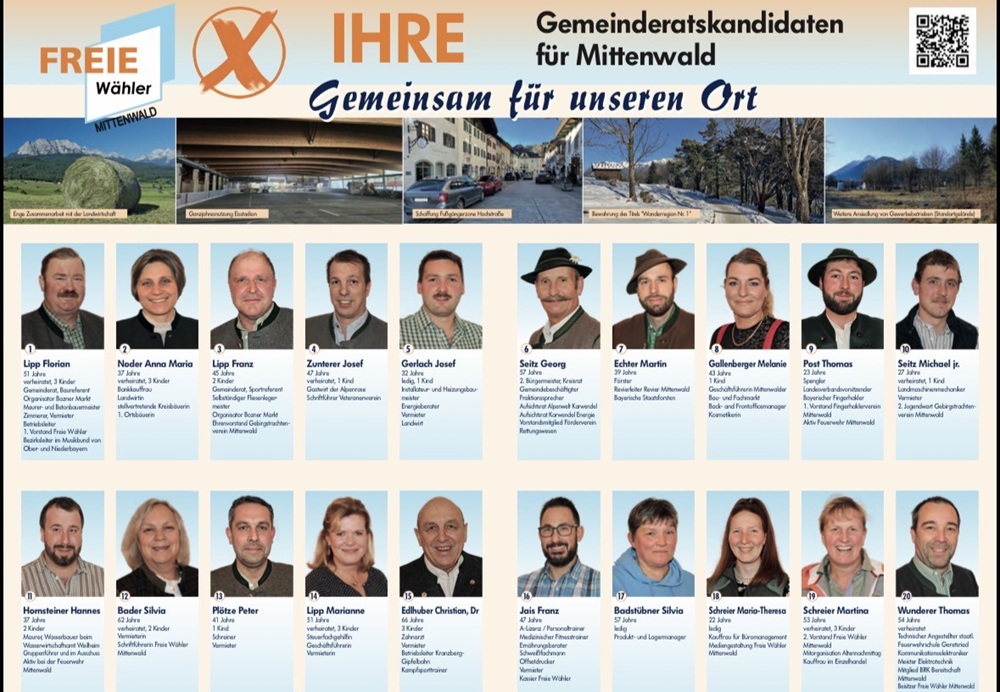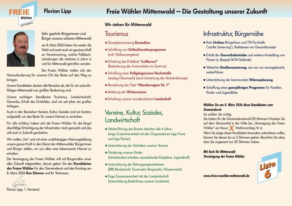 Trotzdem bringen die Freien Wähler mit 21 Bewerbern eine schlagkräftige Kandidatenliste für die Kommunalwahlen 2026 zusammen. Keine Leichtgewichte, sondern gut gewappnete Interessensvertreter und Fachleute der Mittenwalder Schlüsselbranchen wollen all ihre Kräfte bündeln und so das größte Standbein, den Tourismus, nicht nur sichern, sondern weiter nach vorne bringen