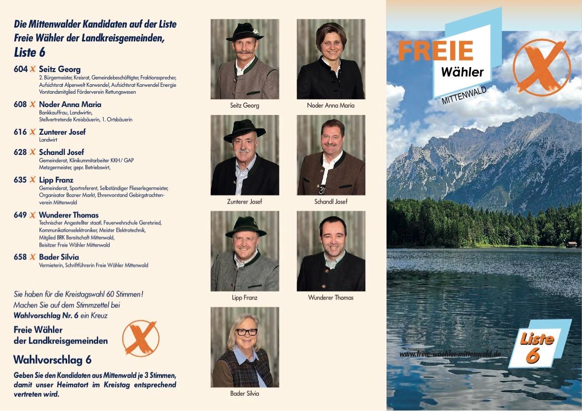 1. Florian Lipp (Maurer- und Betonwerkmeister); 2. Anna Maria Noder (Landwirtin/Bankkauffrau); 3. Franz Lipp, (Fliesenlegermeister); 4. Josef Zunterer junior (Gastwirt/Hotelier); 5. Josef Gerlach (Installationsmeister/Energieberater); 6. Georg Seitz (Zweiter Bürgermeister/Bauhofarbeiter; 7. Martin Echter (Förster); 8. Melanie Gallenberger (Baumarktangestellte); 9. Thomas Post (Spengler); 10. Michael Seitz (Landmaschinenmechaniker); 11. Hans Hornsteiner (Wasserbauer); 12. Silvia Bader (Vermieterin); 13. Peter Plötze (Schreinermeister); 14. Marianne Lipp (Vermieterin/Verwaltung Betonwerk); 15. Dr. Christian Edlhuber (Zahnarzt); 16. Franz Jais (Schweißermeister); 17. Silvia Badstüber (Chemielaborantin); 18. Maria Theresa Schreier (Bankkauffrau); 19. Martina Schreier (Einzelhandelskauffrau); 20. Thomas Wunderer (Rettungssanitäter) – Ersatzmann: Eckard Haug (Chemiker). ha